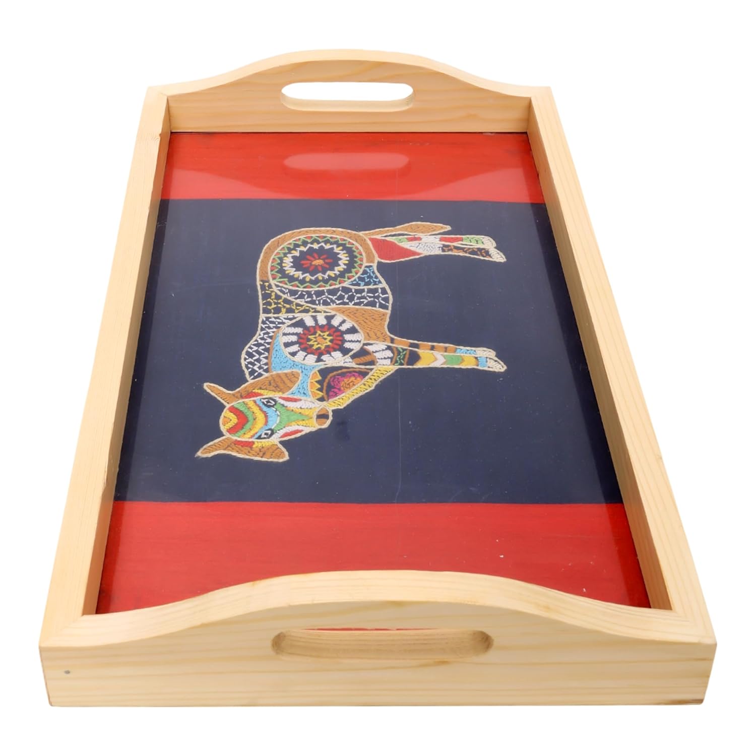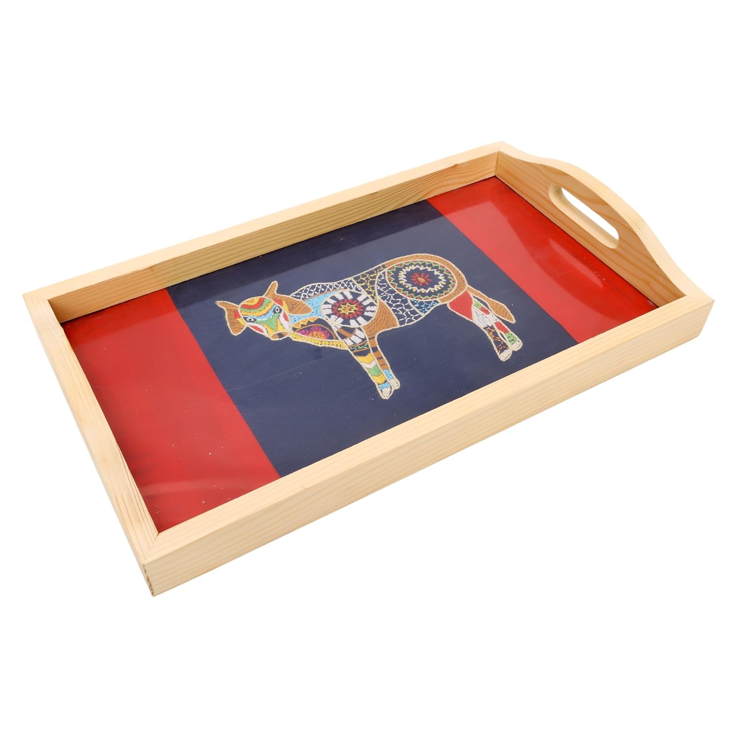 Indha Pine Wood Serving Tray – Hand-Embroidered Indian Cow Motif on Dupion Silk | Natural Pine Table Tray | Coffee Table Décor | Handmade Gift for Home & Dining