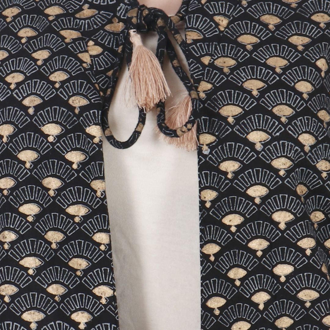 This is a unique Black sleeveless casual shrug with all hand block prints all over in golden. The intricate print on the garment gives an interesting pop of color to it. The shrug could simply be paired with anything, be it a t-shirt, blouse, or kurta. This elegant-looking front-open straight shrug could be a great addition to your wardrobe. This lovely garment also makes a great present for your friends and family. Be your own stylish and grab this piece.