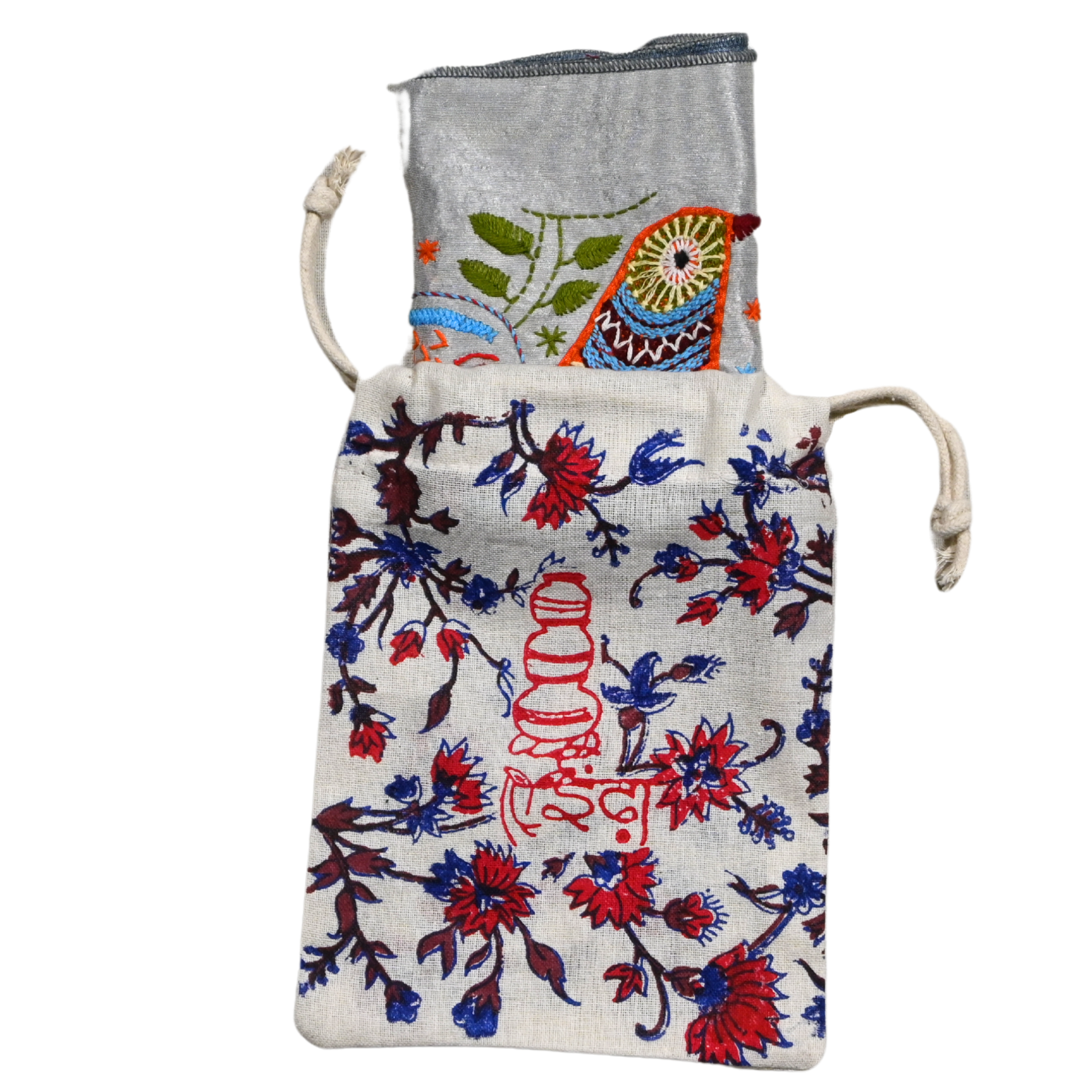 - Packaging: Hand Embroidered Panel with Block Printed Potli.