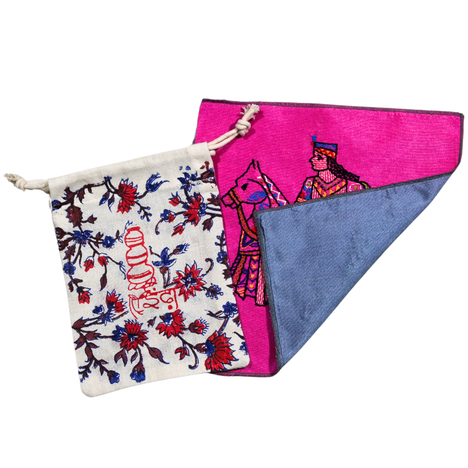 - 🎨 Rich, Vibrant Craftsmanship: Carefully stitched on premium pink dupion silk, the design features a richly adorned horse and rider, brought to life through intricate, colorful threadwork by skilled women artisans.
