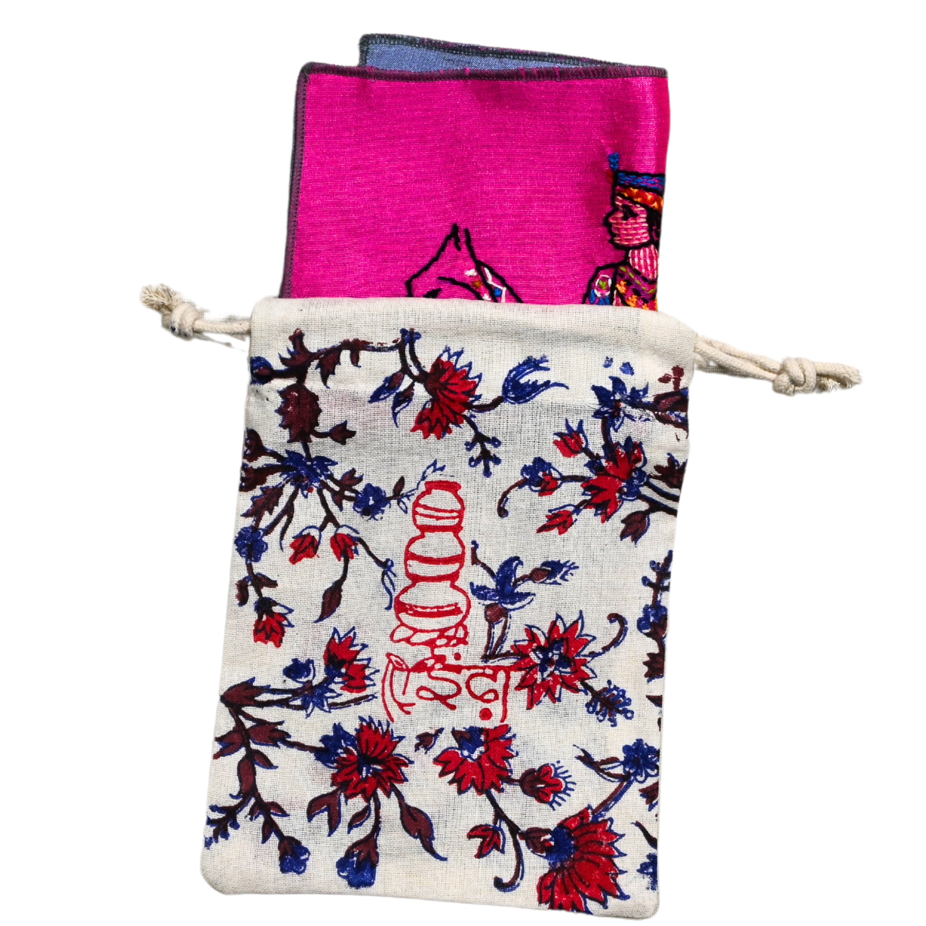 - Packaging: Hand Embroidered Panel with Block Printed Potli.