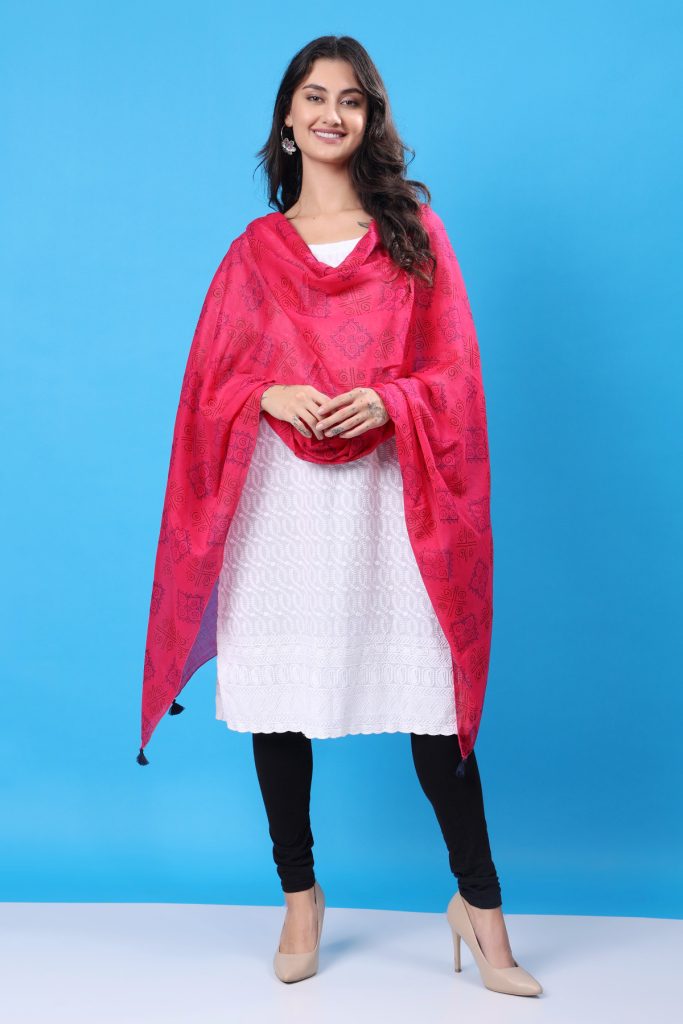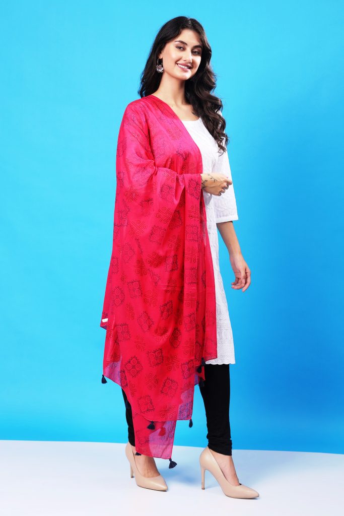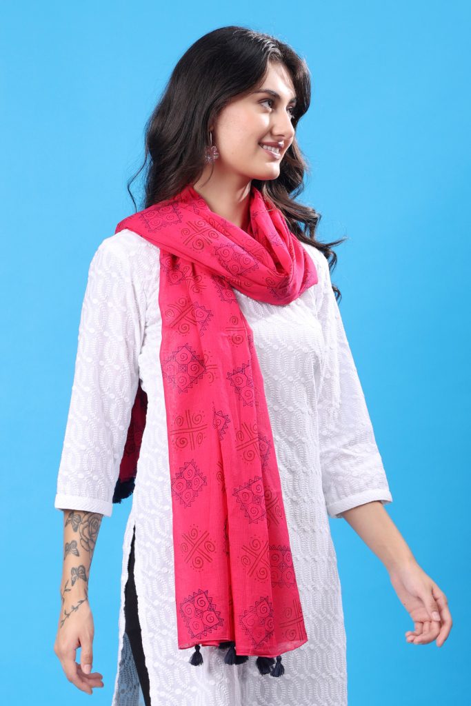 Handcrafted with care, each stole showcases intricate block printing techniques that highlight the skill of artisan craftsmen. The vibrant geometric designs stand out beautifully against the delicate pink background, creating a versatile piece that seamlessly integrates with both ethnic and Indo-Western ensembles. Whether you’re dressing up for a special occasion or seeking a stylish addition to your everyday wear, this stole is a statement of refined taste and creativity.