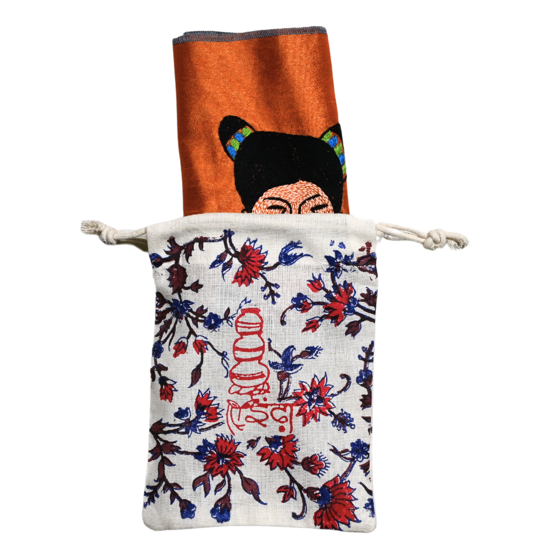 - Packaging: Hand Embroidered Panel with Block Printed Potli.