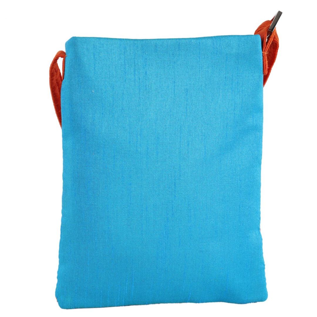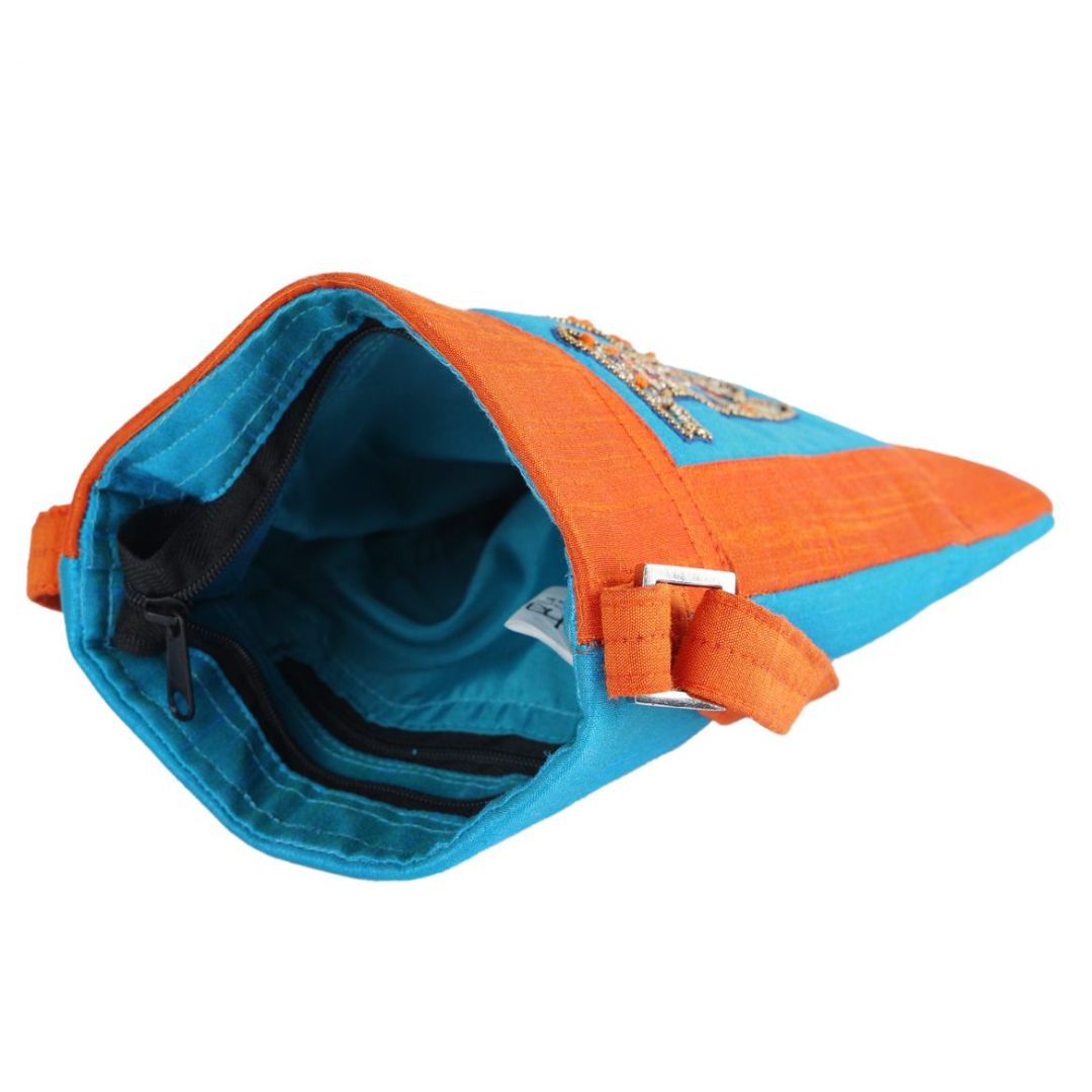 Are you feeling incomplete and feel like something is missing from your outfit or even your travel regime. Feel the need that, I want to own this particular accessory to style my outfit and make it a complete fashion ensemble. Looking for something pretty and stylish to keep your diary or travel accessories. Then no need to look anywhere else, as we have for you a beautiful hand embroidered sling bag from Indha that will make your outfit complete along with serving the purpose of keeping all your belongings secure at one place and making it travel friendly. The sling bag is made up of orange and sky blue dupion silk, where the blue and orange combination is on the front and plain blue on the back. This sling bag has camel design hand embroidered in zardozi work on the front. It is a great travel utility product and easy to carry as it even has an orange long strap to carry it on your shoulder with ease. A no-fuss sling bag for when you are on the move. Pair it with Indian or Western outfits to add a colorful touch. Add it for a classy and chic vibe for the festive season. You can carry your mobile, accessories, diary, cosmetics or any loose Item in this sling bag. A purchase of yours would help in the livelihood of an Indha artisan. Orange & Sky Blue Sling Bag