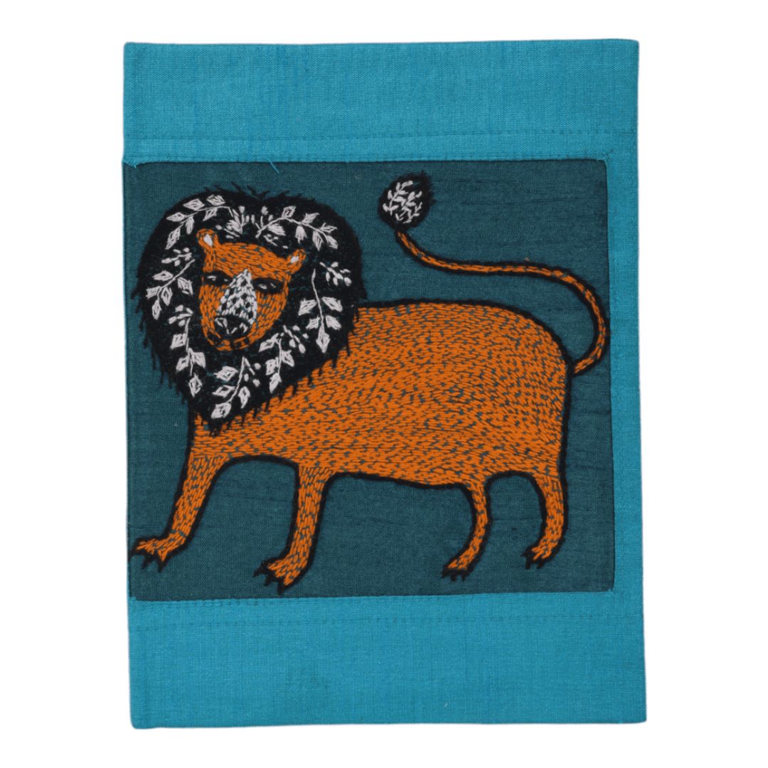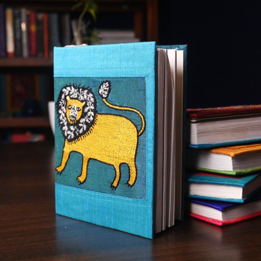 - Cover: Features a captivating lion hand embroidery on luxurious teal green and sky blue dupion silk.