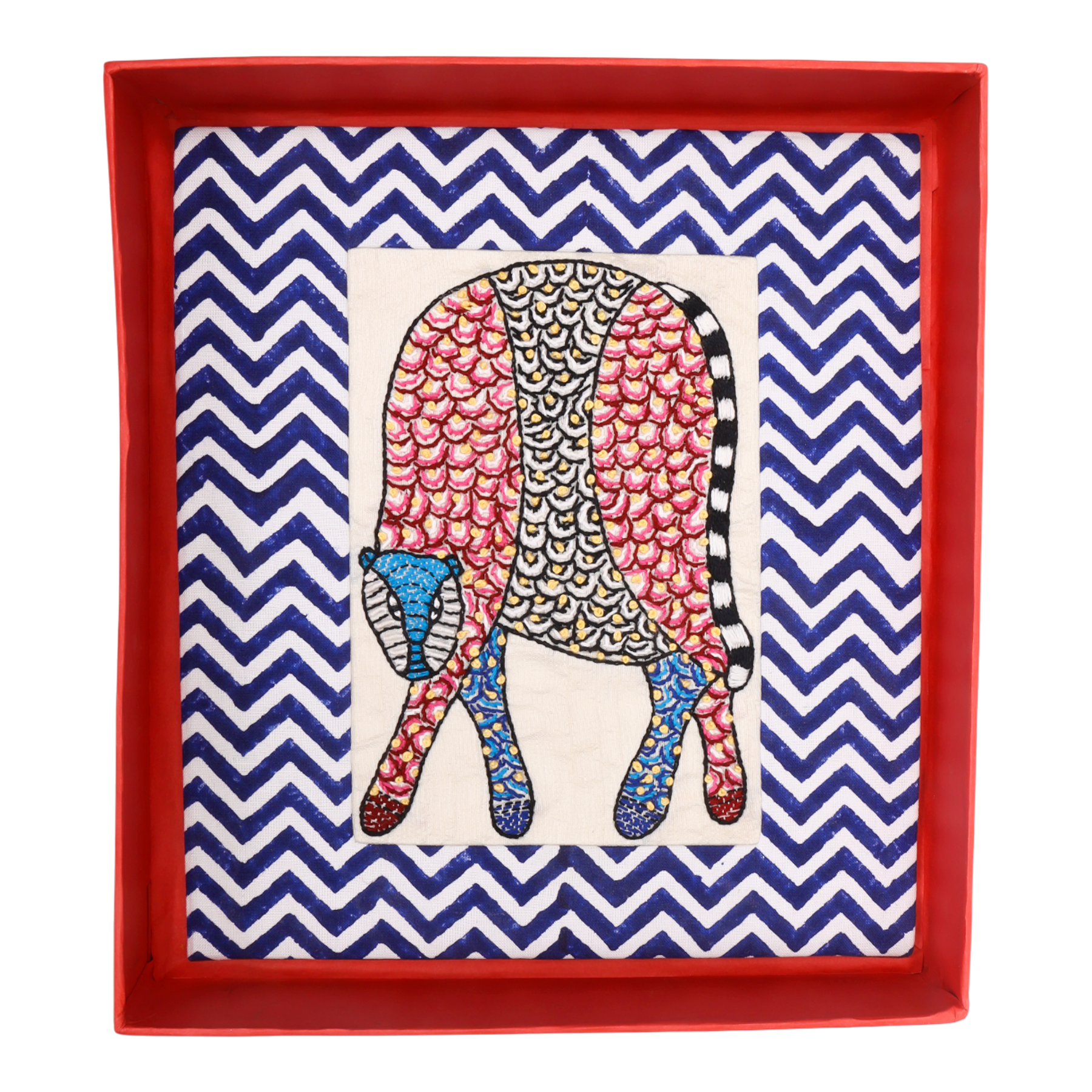 This striking piece features a leopard motif inspired by Gond art, rendered in meticulous hand embroidery. The panel is bordered with a hand block-printed fabric frame (blue chevron) and comes with a mini wooden easel for instant display on desks, shelves, or consoles. Lightweight and easy to carry—an elegant souvenir that showcases Indian handmade art.