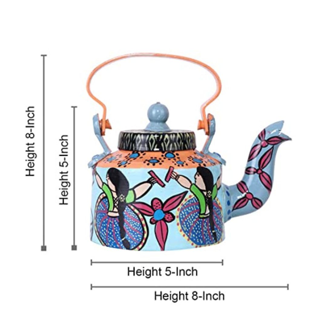 Handpainted Tribal Tea Kettle This Exquisite Hand Painted Aluminum Kettle is created by West Bengal Tribal Artisans. Design Unique and original to adorn your home. Colours used is Oil Enamel and will lasts a lifetime on your Showcase of your Living Room. Great handmade Item for Gift. Indha helps Environment and Empower Women from the Rural underserved background to create such a beautiful handmade Product. Your Choice will change the lives of these Rural Artisans and we can be part of Make in India products.Handpainted Tribal Tea Kettle