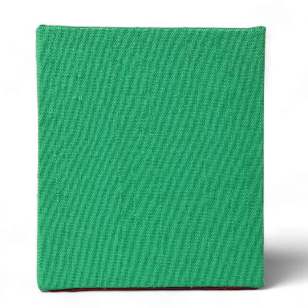 - Material: Cerise red and ocean green dupion silk exterior with reprocessed wood interior