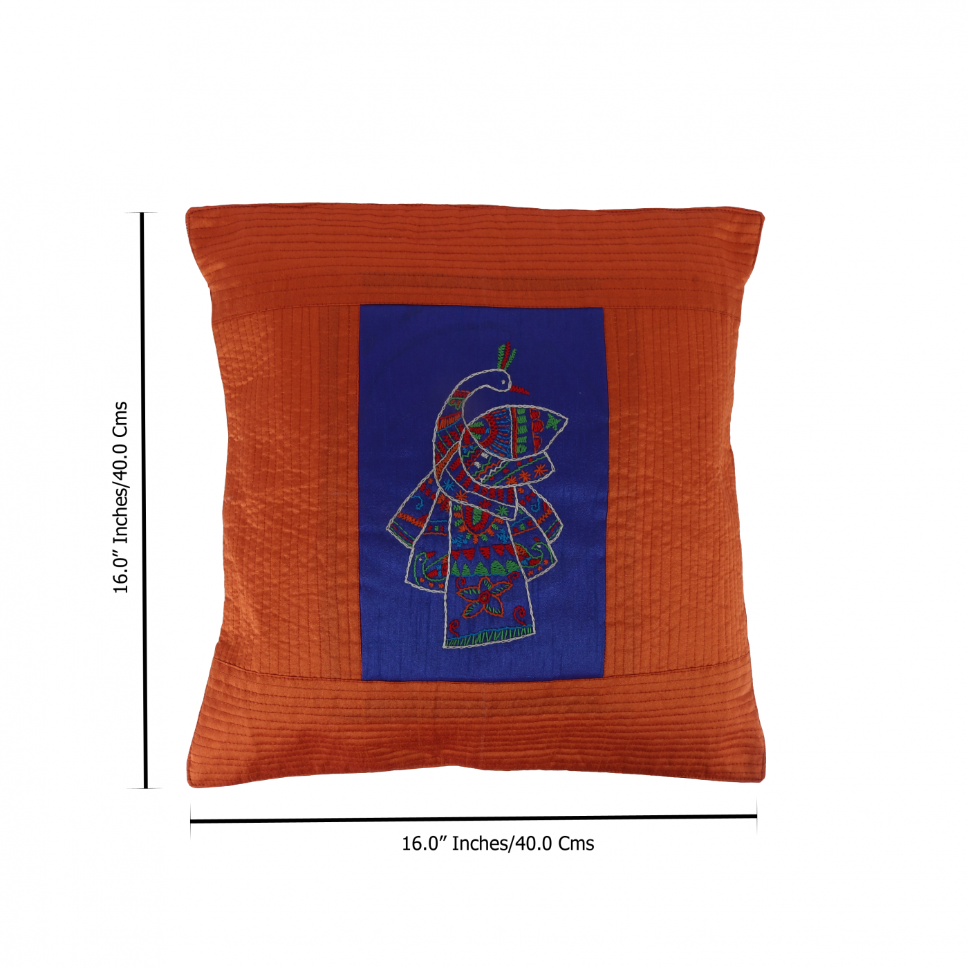 Here we have a Set of two cushion cover in the combination of Orange and Blue Dupion Silk with Multicolor Peacock hand embroidered on it by Tribal Artisans of Bengal. These Cushions add color to your living room and gives away your love for art and handmade. A Great Gift for Anniversaries, Diwali Gifting, Christmas Gifting, Birthdays. Can even be used as a unique print gift for corporate gifting too. Your Choice will impact the life of artisans who put together this work of art for you.
