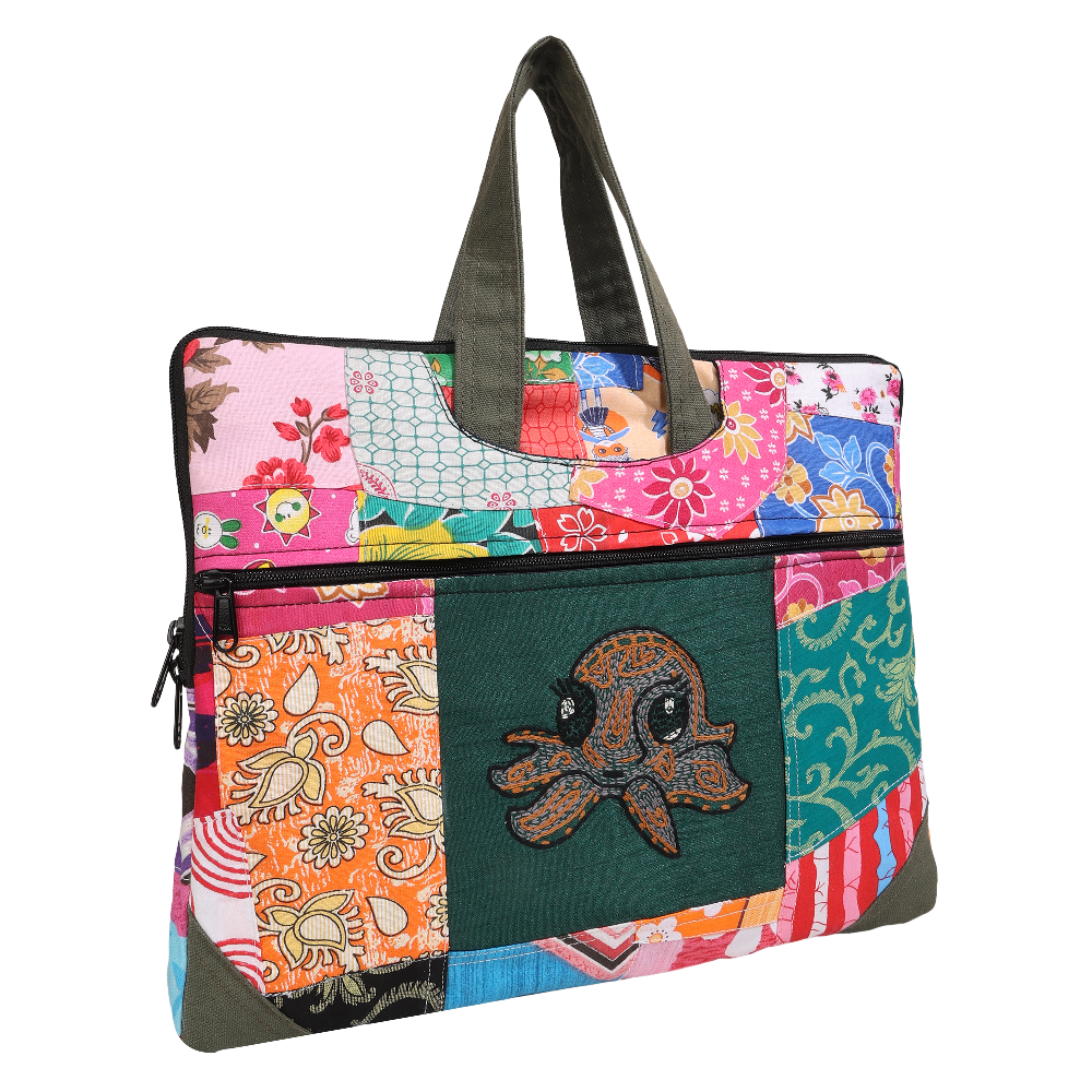 Add a splash of color and a touch of conscience to your everyday essentials with Indha’s Multicolor Upcycled Laptop Sleeve. Lovingly handcrafted by rural women artisans, each piece is a celebration of sustainability and traditional Indian embroidery. The sleeve is made using repurposed cotton fabric scraps, arranged in a vibrant patchwork design, and adorned with a hand-embroidered motif—making every sleeve truly unique. With a size of 11.0 x 14.5 inches, it comfortably fits most 14” laptops while remaining lightweight and travel friendly. Soft foam padding and taffeta lining protect your device, while a high-quality YKK zipper ensures long-lasting use. Whether you’re headed to a meeting, a café, or your study space, this Octopus motif laptop bag sleeve combines functionality, culture, and conscious fashion. Support handmade. Support women. Support Indha.