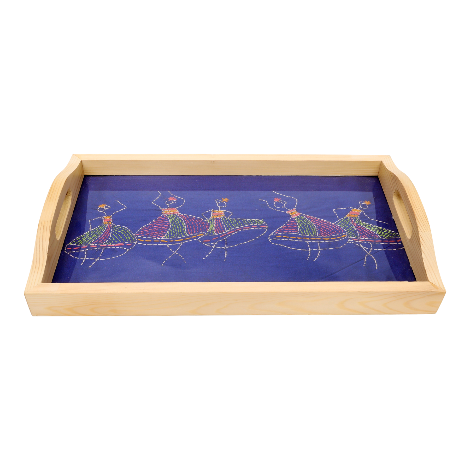 A light, natural pine tray featuring joyful hand embroidery—made with care by Indha women artisans.